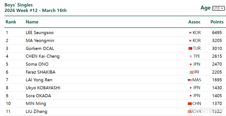 U15男单世界前十国乒小将只有闵明一人,第11是刘子航,而且日乒前十中却有三人,换言之日乒在U19、U17、U15世界男单前十合计有8人,而国乒合计只有3人,这个差距非常之大。