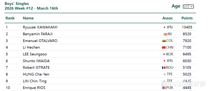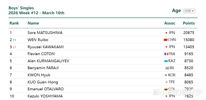 最新一期的U19男单世界前十排名:松岛辉空、温瑞博、川上流星、科顿、库尔曼加李耶夫、法拉吉、金赫基、郭冠宏、奥塔瓦罗、吉山和树。